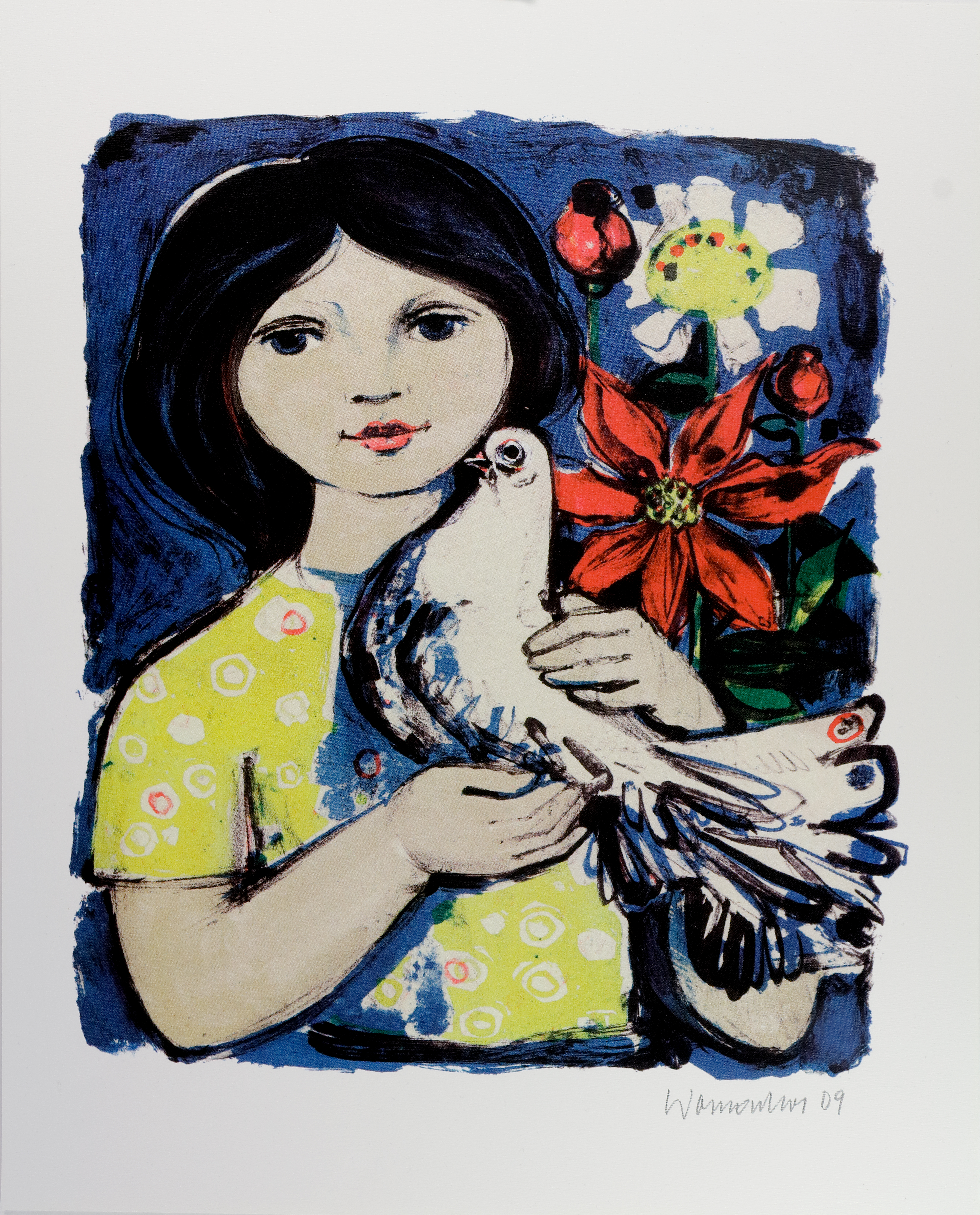 Mädchen mit Taube. 2009. Farboffsetlithographie. 39,5 x 34 cm, Bg. 50 x 40 cm. Mit Bleistift signiert und datiert. (1119-1)