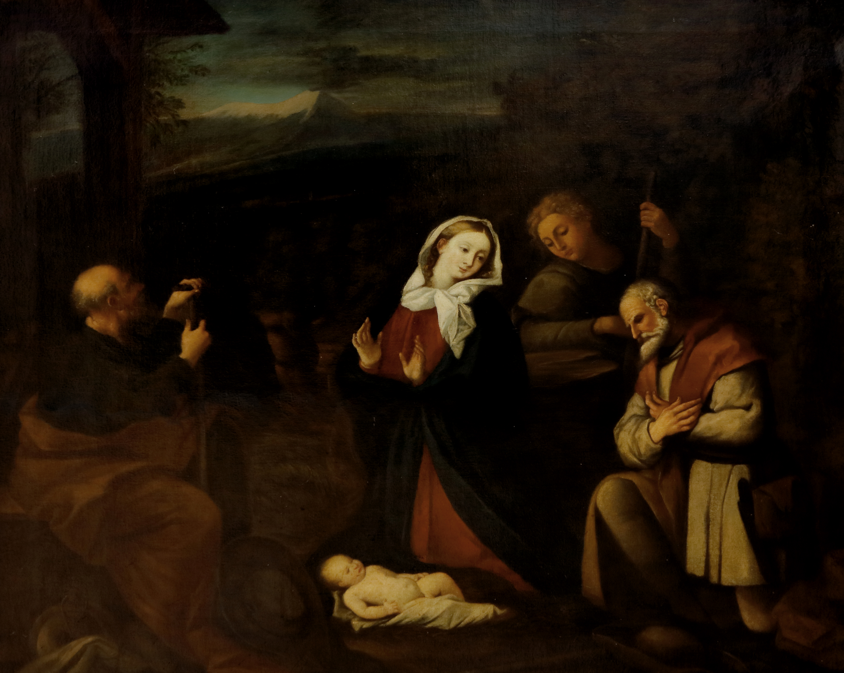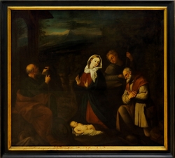 Die Anbetung der Hirten. Öl auf Leinwand, doubliert. 118 x 133 cm, mit Rahmen 136 x 151 cm. - Die Zuschreibung laut Gutachten vom 3. 10. 1948 von Dr. E. Heinrich Zimmermann, Geh. Regierungsrat, Direktor der Gemäldegalerie der ehemals Staatlichen Museen, Berlin. - "Das vorliegende Gemälde zeigt in der stärkeren Beseeltheit von Figuren und Landschaft noch ganz die Nähe der Kunst Giorgiones und ist in seiner Geschlossenheit die beste bisher bekannt gewordene Fassung dieses Themas". (Zimmermann). (1121-1)