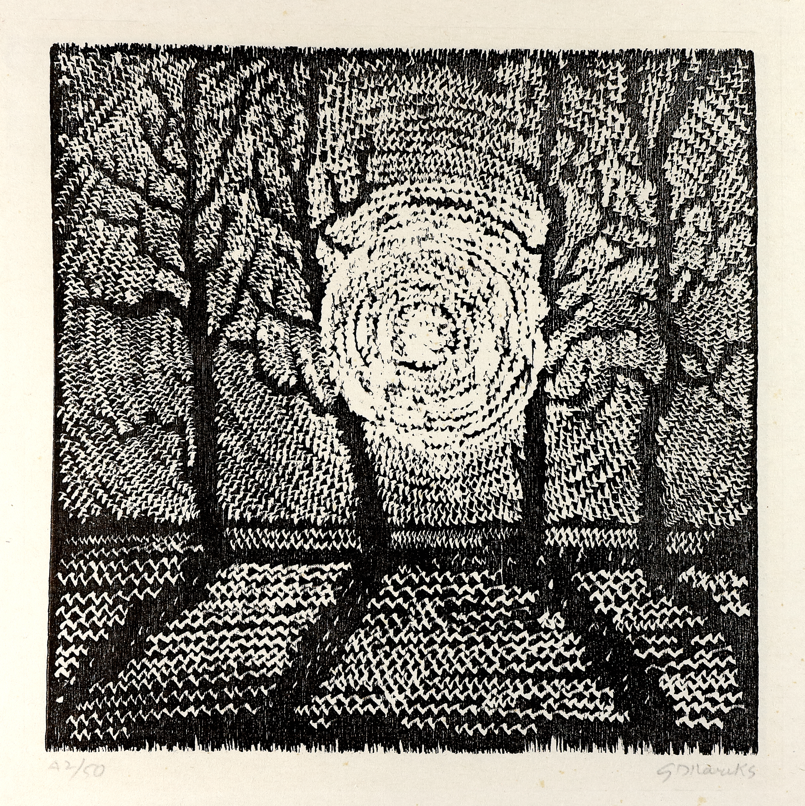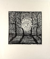 Sonne zwischen Bäumen. 1967-68. Holzschnitt auf Japan. 30 x 30,4 cm, Bg. 58 x 46,4 cm.. Signiert und nummeriert. Exemplar 42/50. - Lammek H 427. - Vereinzelt winzige Stockflecken im Rand. (1128-2)