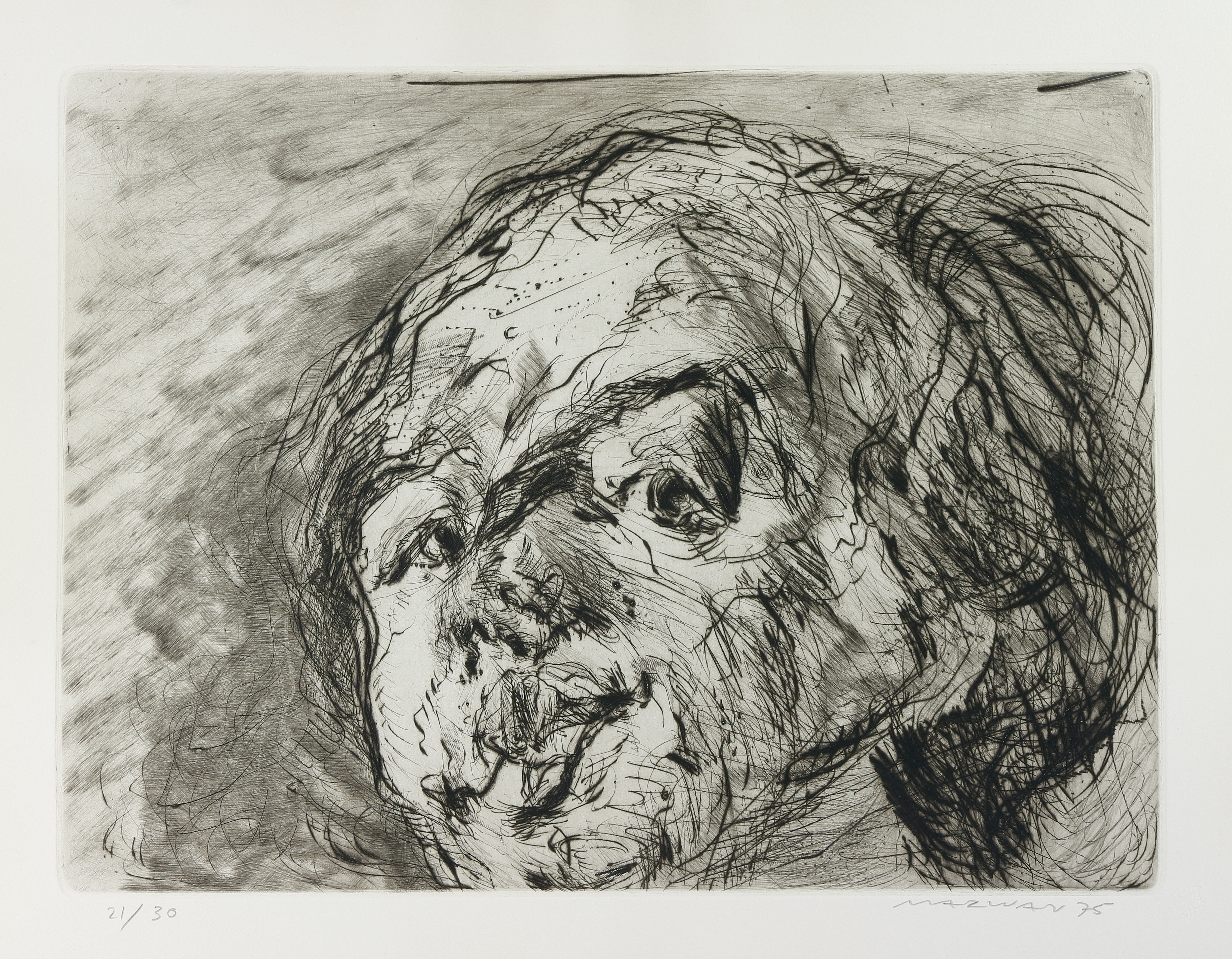 Selbstporträt. 1975. Kaltnadelradierung auf kräftigem Karton. 29,7 x 39,2 cm, Bg. 40 x 50 cm. Signiert, datiert und nummeriert. Exemplar 21/30. Im Rand etwas gebräunt, kleiner Wasserrand links unten. (1135-3)