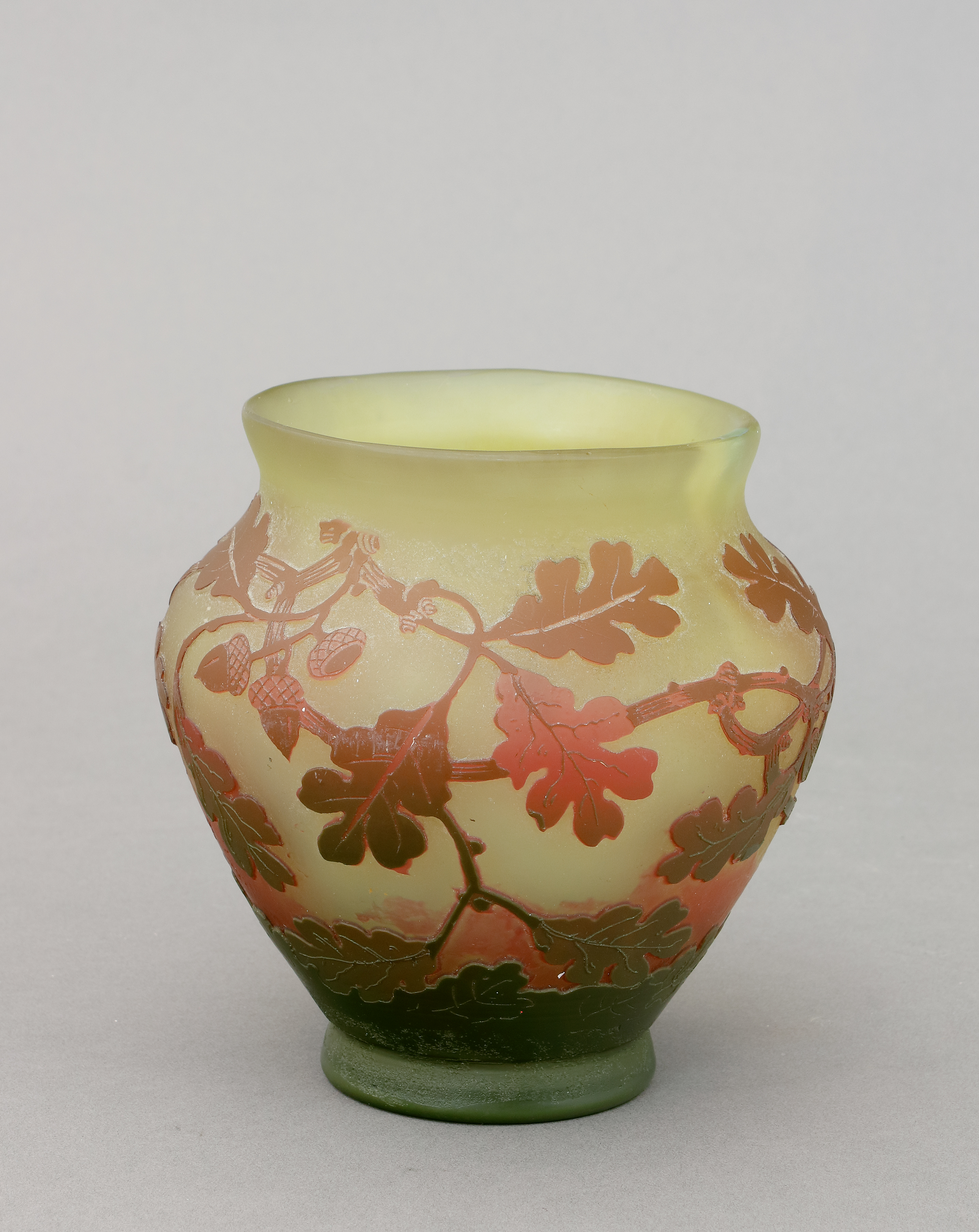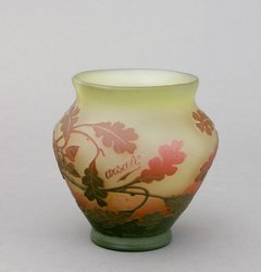 Baluster-Form mit eingezogenem Rand. Milchig gelbes Glas, Rot/ Dunkelgrün über-unterfangen mit geätztem Eichenblatt-und Früchte-Dekor. Auf der Wandung bezeichnet in Hochätzung "Arsall". Im Boden geritzt 3431. H 13 cm. (988-1)