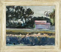 Landschaft bei Villars (Provence) im Gegenlicht. 20. Sept. (19)89. Öl auf Leinwand. 46 x 55,5 cm. Links unten und rückseitig signiert, sowie rückseitig datiert und bezeichnet. Gerahmt.  (988-10)