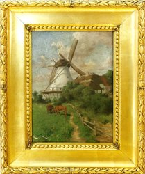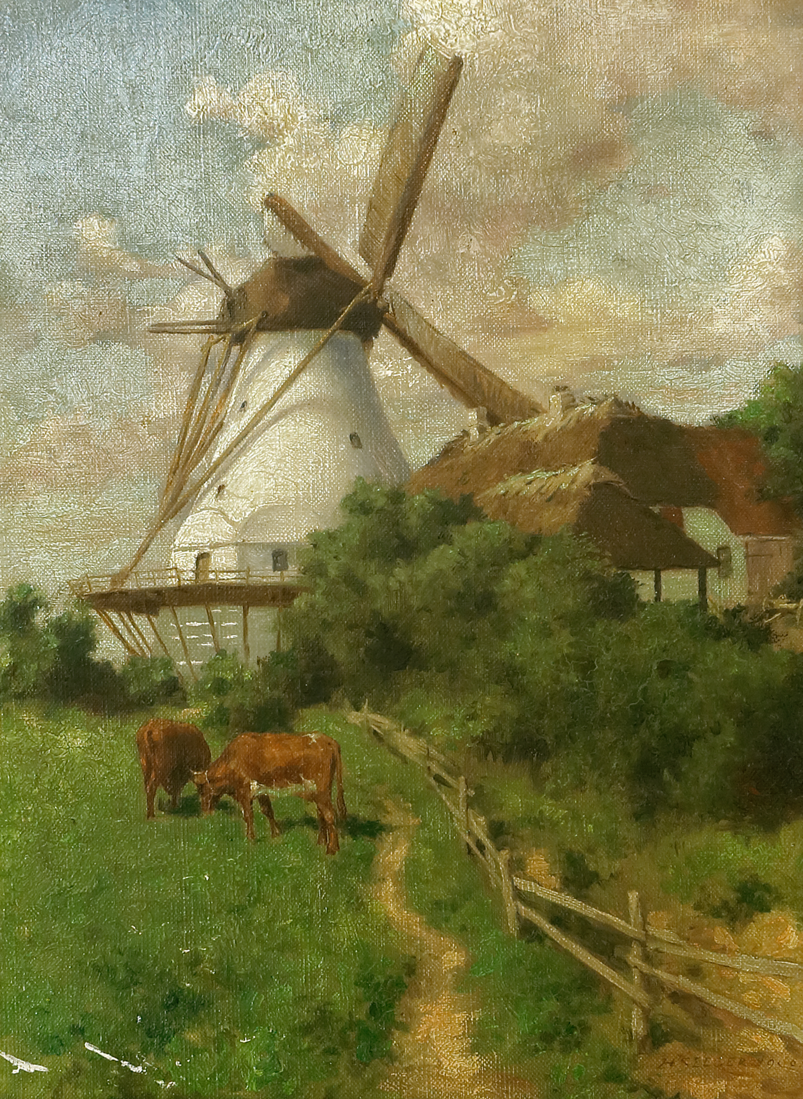 Sommerfrieden. Weidende Kühe vor einer Windmühle. 1900. Öl auf Leinwand. 46 x 33 cm. Rechts unten signiert und datiert sowie rückseitig auf altem Papieretikett alt bezeichnet. Gerahmt. (988-15)