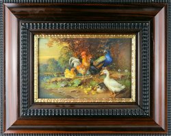 Enten, Hühner und Pfau am Ufer. Öl auf Malkarton. 23,8 x 15,8 cm. Links unten signiert. Gerahmt. (988-19)
