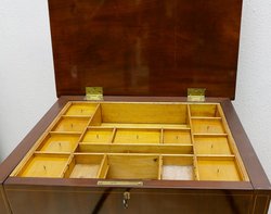 Rechteckiger Zargenkasten mit zwei Schüben auf zwei geschwungenen X -Beinen. Scharnierte Klappe für den oberen Schub mit rechteckiger Fächereinteilung und Abdeckung. 70 x 60 x 43 cm. (991-1)