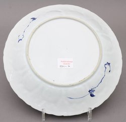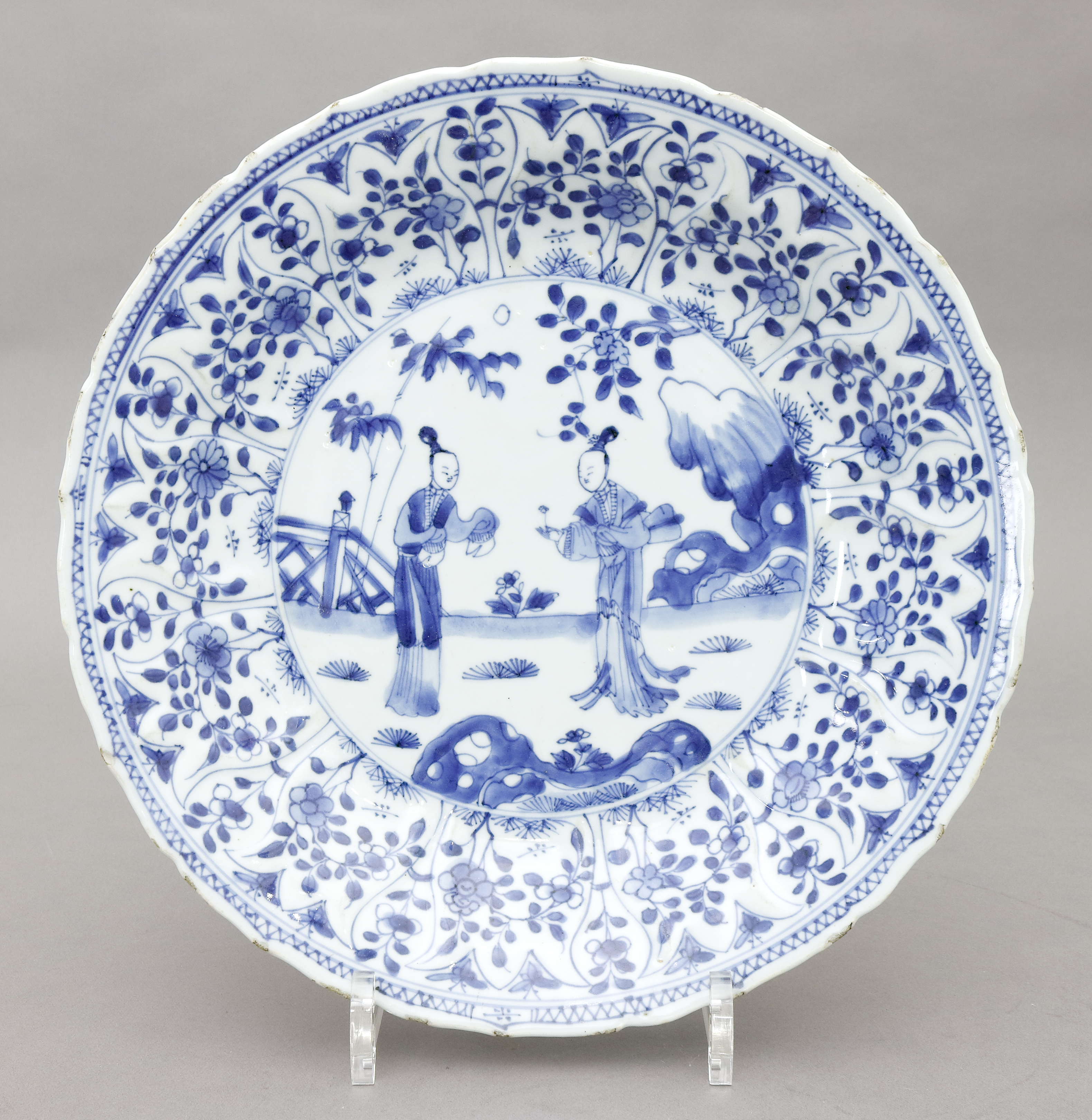 Porzellan. Blaugrauer Scherben, unterglasurblau gemalter floraler Dekor auf der leicht ansteigenden Fahne, mittig figürliche Szene. Rückseitig mit zwei Blattgirlanden. D 27,5 cm. Minimal bestossen. (991-4)