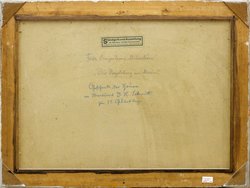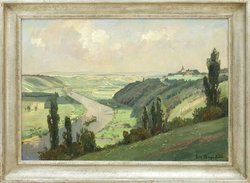 Die Vogelsburg am Main. Öl auf Malkarton. 50 x 69 cm. Rechts unten signiert sowie rückseitig bezeichnet. Rückseitig auf altem Papieretikett "Ständige Kunst-Ausstellung der Münchner Künstler-Genossenschaft im Gebäude des alten Nationalmuseums". Gerahmt. (992-16)