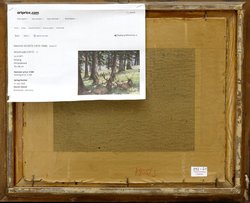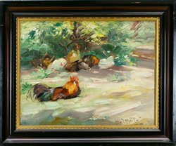 Sommerlandschaft mit Hühnern. (19)17. Öl auf Malkarton. 35,5 x 43,5 cm. Rechts unten signiert und datiert. Gerahmt. -Schütz war Meisterschüler von Heinrich von Zügel und vor allem bekannt durch seine Gemälde mit Tieren in Landschaften. (992-21)