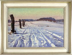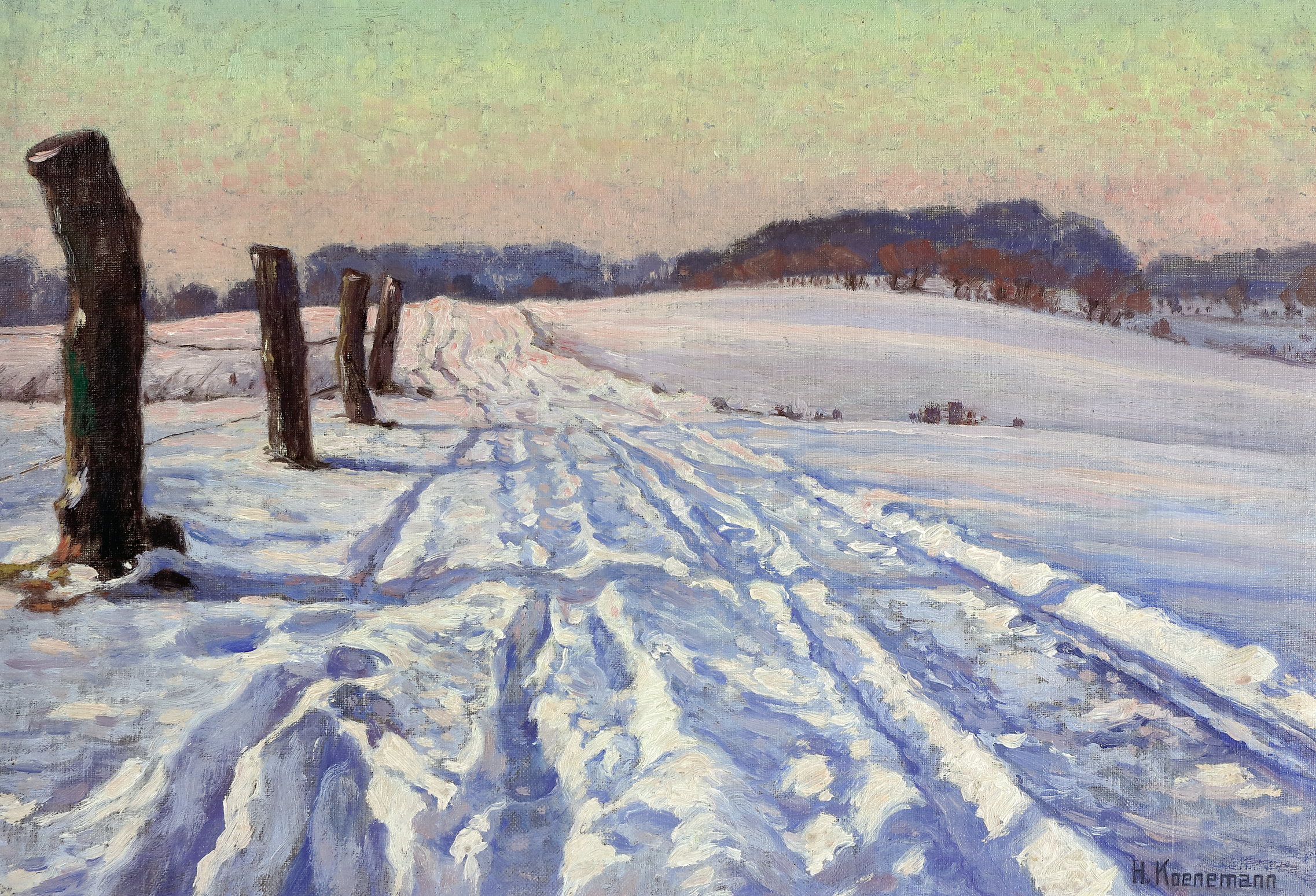 Wintertag. Weg bei Zippendorf (bei Schwerin). Öl auf Leinwand auf Malkarton. 36 x 50 cm. Rechts unten signiert sowie rückseitig bezeichnet. Gerahmt. -Koenemann war u.a. Schüler von Eugen Bracht. Er war in Berlin und ab 1909 in Schwerin tätig. (992-27)