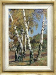 Sommerlandschaft mit Birken. Öl auf Malkarton. 48 x 34 cm. Rechts unten signiert. Gerahmt. (992-28)