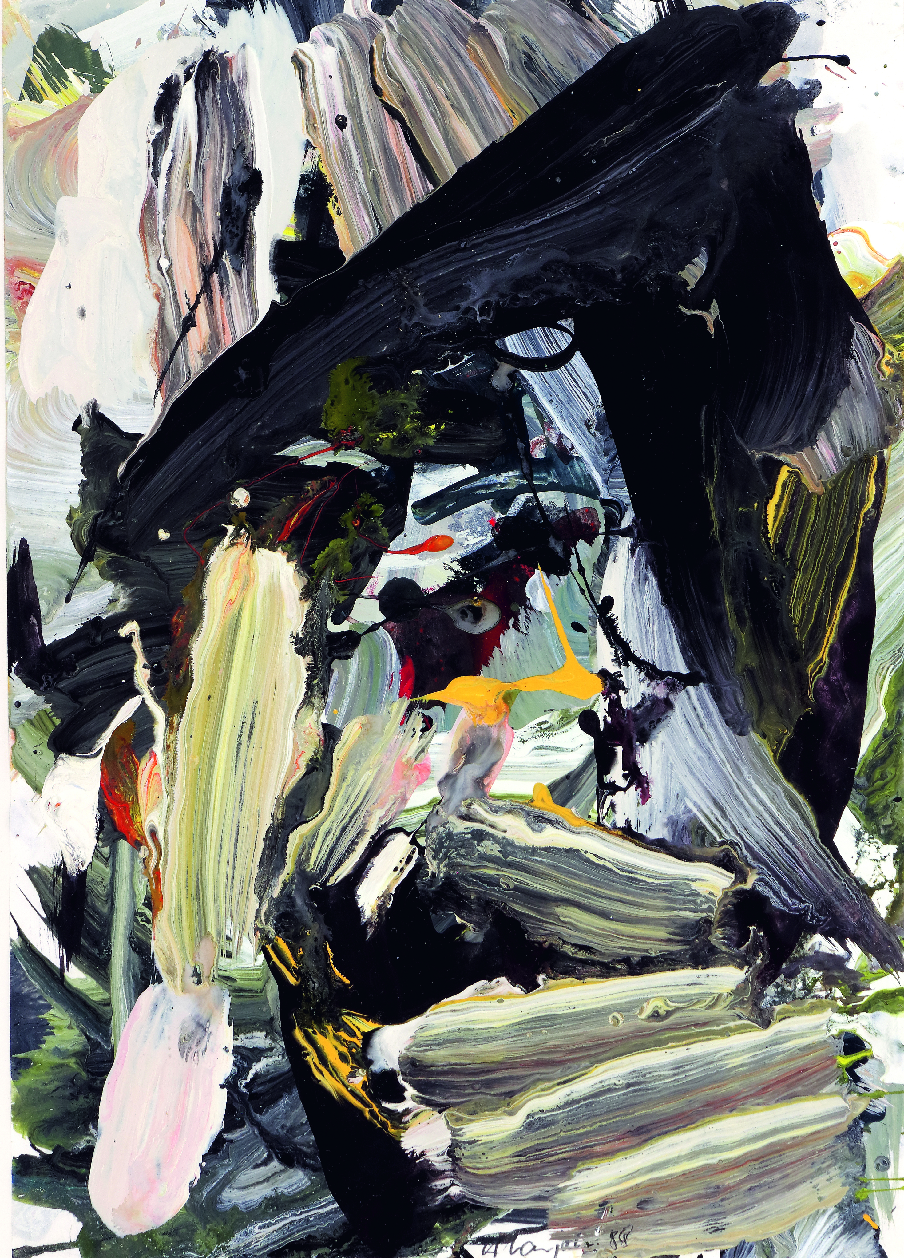 Ohne Titel. 1988. Gouache auf Karton. 29,5 x 21 cm. Am unteren Rand signiert und datiert. Unter Glas gerahmt. Rückseitig mit altem Klebeschild der Galerie Kremer-Tengelmann, Köln, N° Z V/88. (992-29)