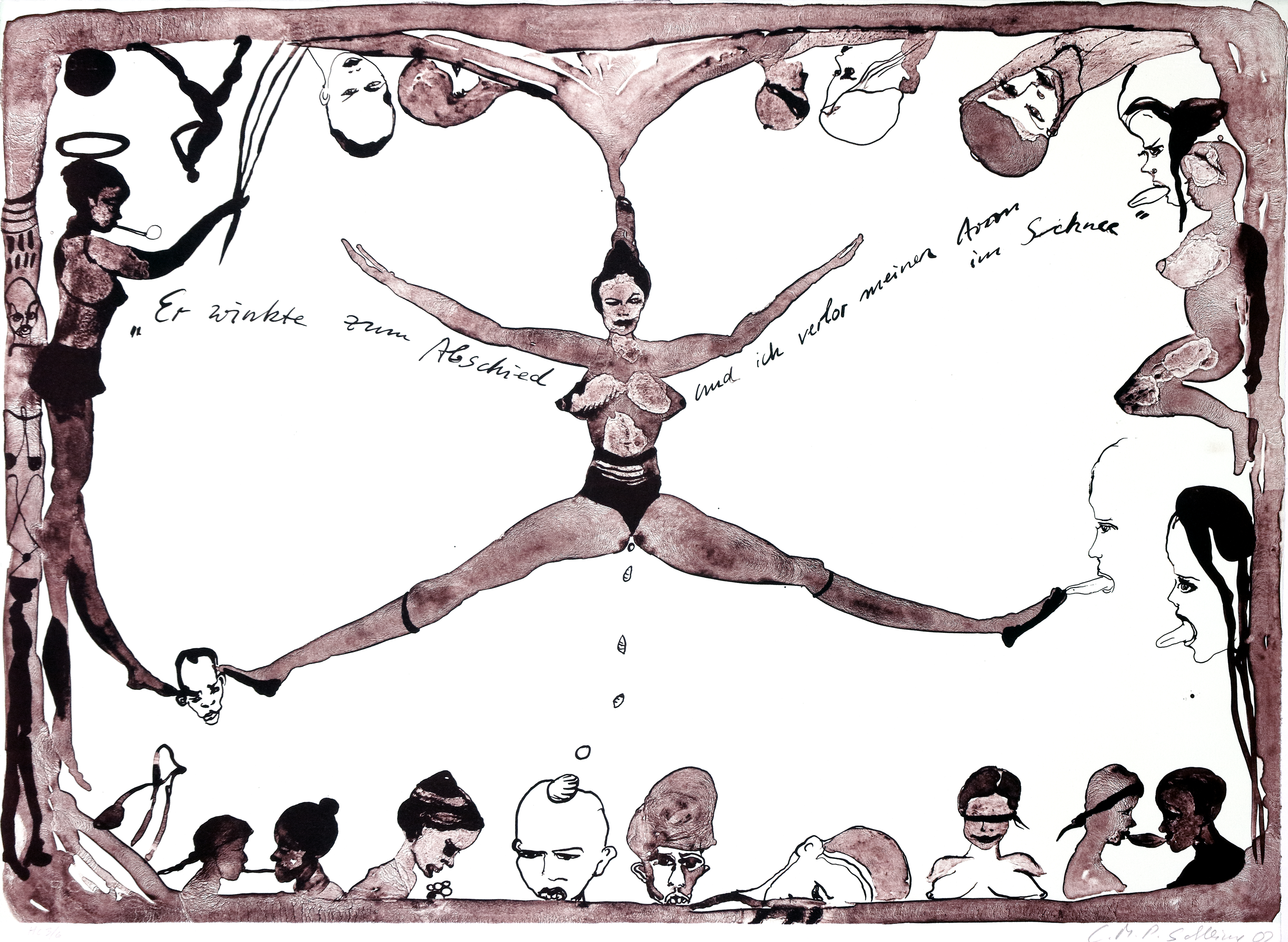 La Palma) Er winkte zum Abschied und ich verlor meinen Arm im Schnee. (2002). Farblithographie auf Arches France. 56,5 x 77 cm. Signiert, datiert und bezeichnet HC 3/6.  (992-35)