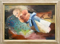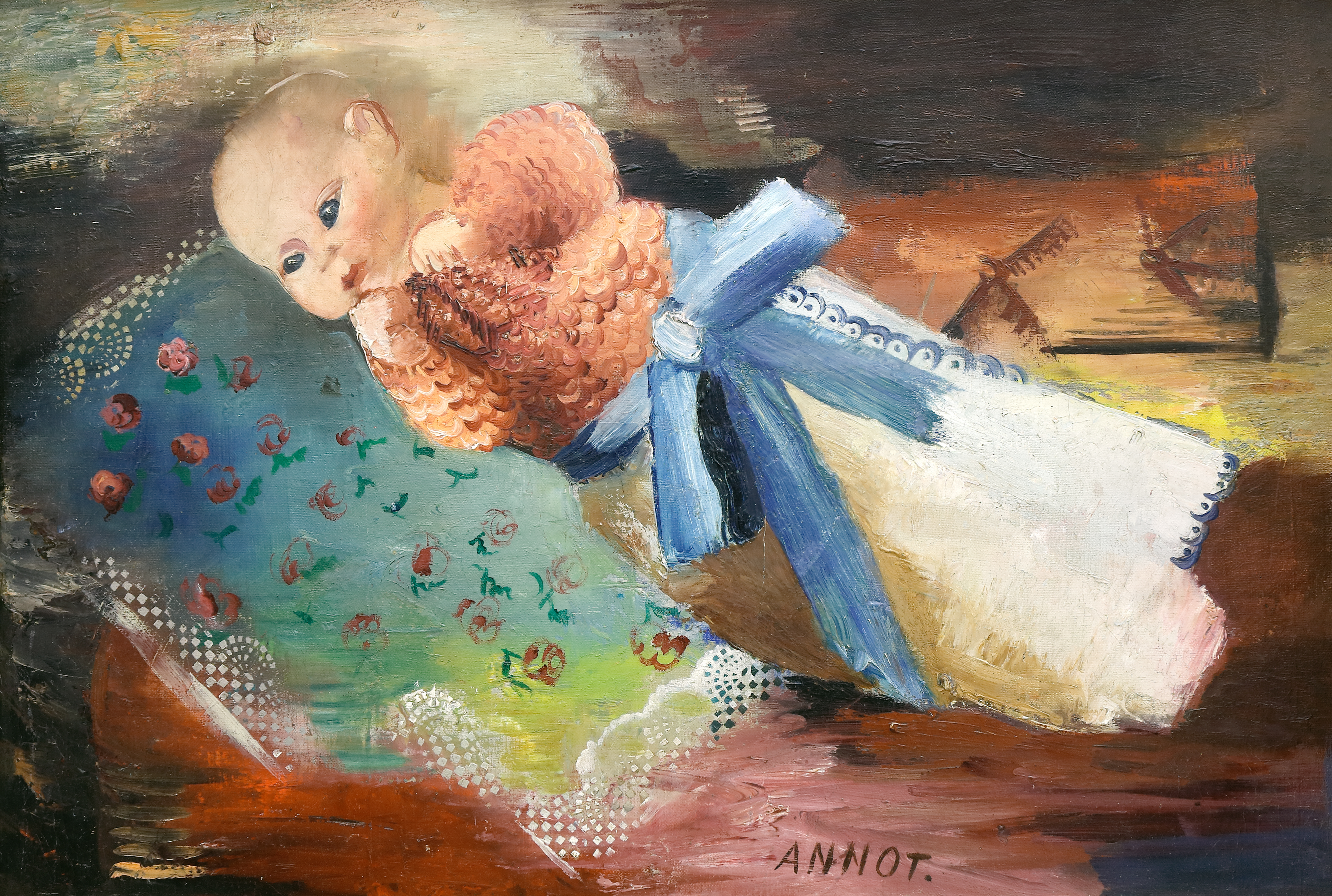 Frank Arne, der Sohn der Künstlerin, als Baby. November, 1928. Öl auf Leinwand, doubliert. 50 x 73 cm. Am unteren Rand signiert ANNOT. Gerahmt. (992-5)