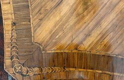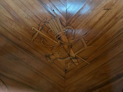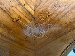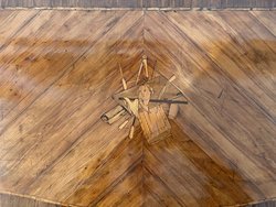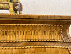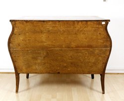 Italien Dreiseitig gebauchte Kommode mit eingezogenem oberem Teil. Reiche Marketerie in der Art von Schachtelhalmmuster, das hier als profilierte Rahmung der Schubladen, Seitenfelder und Kommodenplatte auftaucht. Seitenteile und Kommodenplatte haben Trophäen der Jagd, der Architektur und des Fischfangs als Marketerie und sollen von Guiseppe Levati (1739 -1828), italienischer Maler und Designer, stammen. Bronzebeschläge. 95 x 105-116 x 57 cm. Vergleichbare Möbelstücke befinden sich im Wien und Mailand. Um 1765.  (993-12)