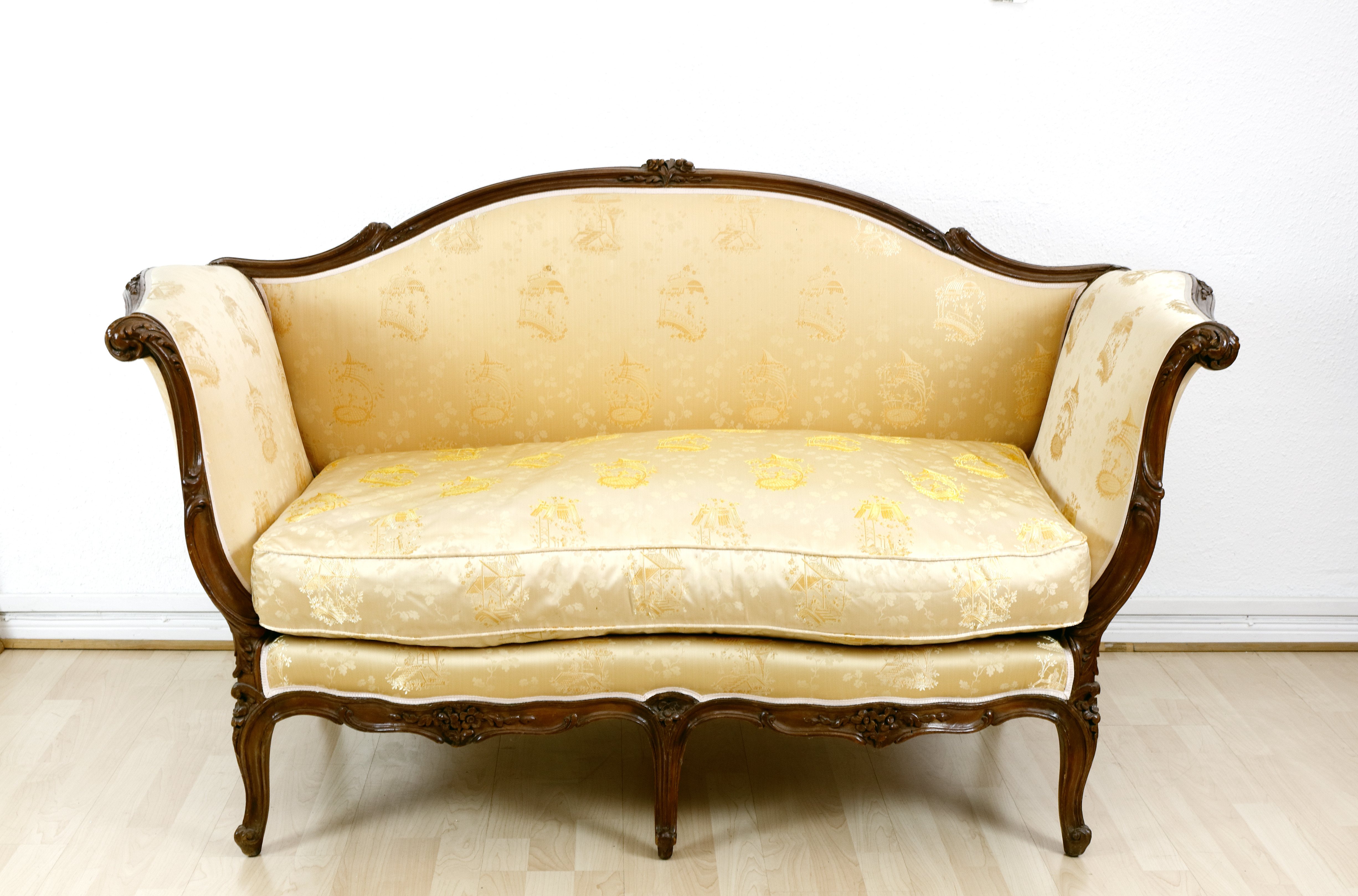 Schwungvoller Rahmen mit Blatt-und Blüten, äußerst fein und stilvoll geschnitzt mit geschwungenen Seiten und bewegter Rückenlehne. Gold/Gelb in Seide mit chinesischen Motiven gepolstert. Am unteren rückseitigen Rahmen signiert C.L. Burgat. Um 1750. 90 x 156 x 60 cm. -C.L. Burgat erhielt seinen Meistertitel 1744 und hatte eine Werkstatt in der Rue de Cléry in Paris und danach in Rue Feydeau. Seine Möbel stehen u.a. in dem Königlichen Schloß in Stockholm, Schweden, zu dessen Ausstattung er beigetragen hat. -Lit.: vgl. Comte de F. Salverte "Les Ebenistes du 18e Siècle". (993-15)