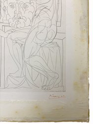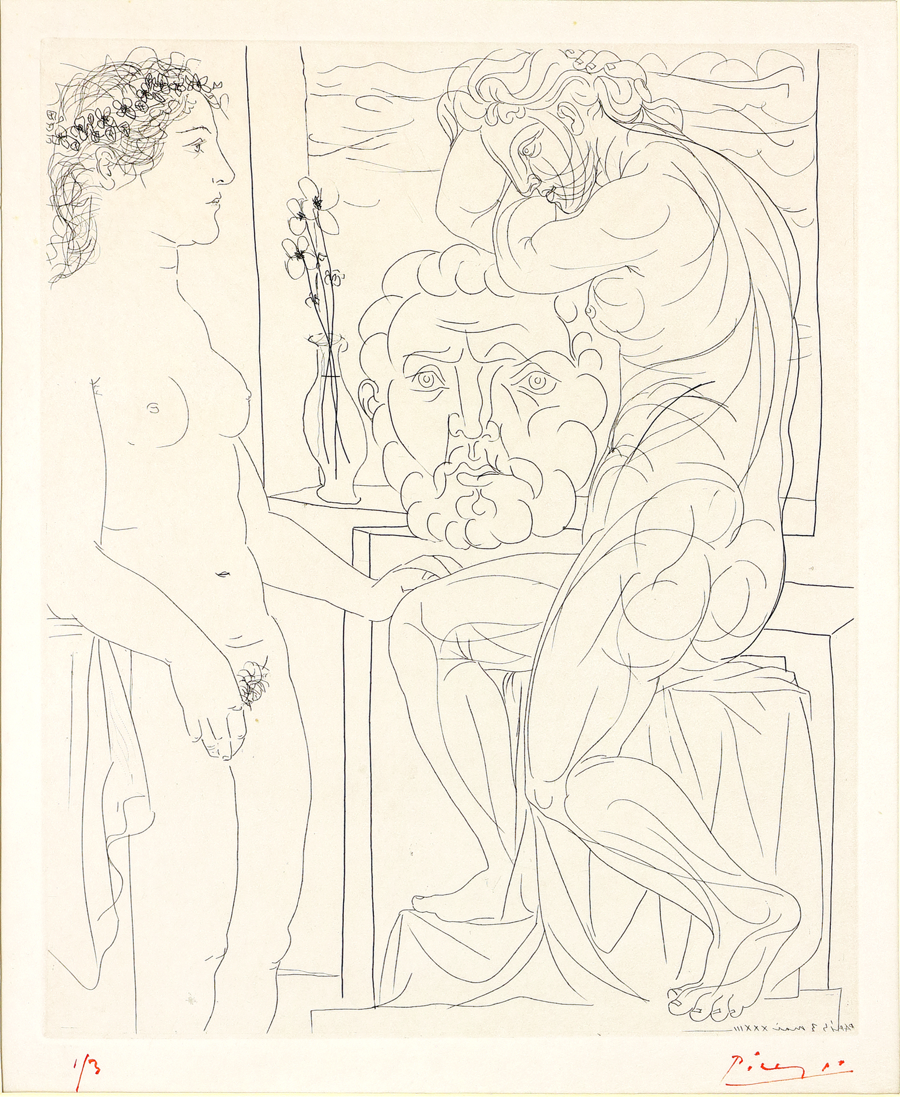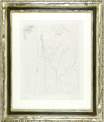 Sculpteur et son modèle avec un groupe sculpté. (1933). Radierung, auf die Unterlage kaschiert, hinter Passepartout montiert, im Rand etwas stockfleckig. 19,4 x 26,8 cm. Mit rotem Stift signiert und nummeriert 1/3. In der Platte datiert. -Bloch 167; Geiser-Baer 320 Bd. -Provenienz: Grisebach, A50, Lot 470, 1996; Berliner Privatbesitz. (993-2)