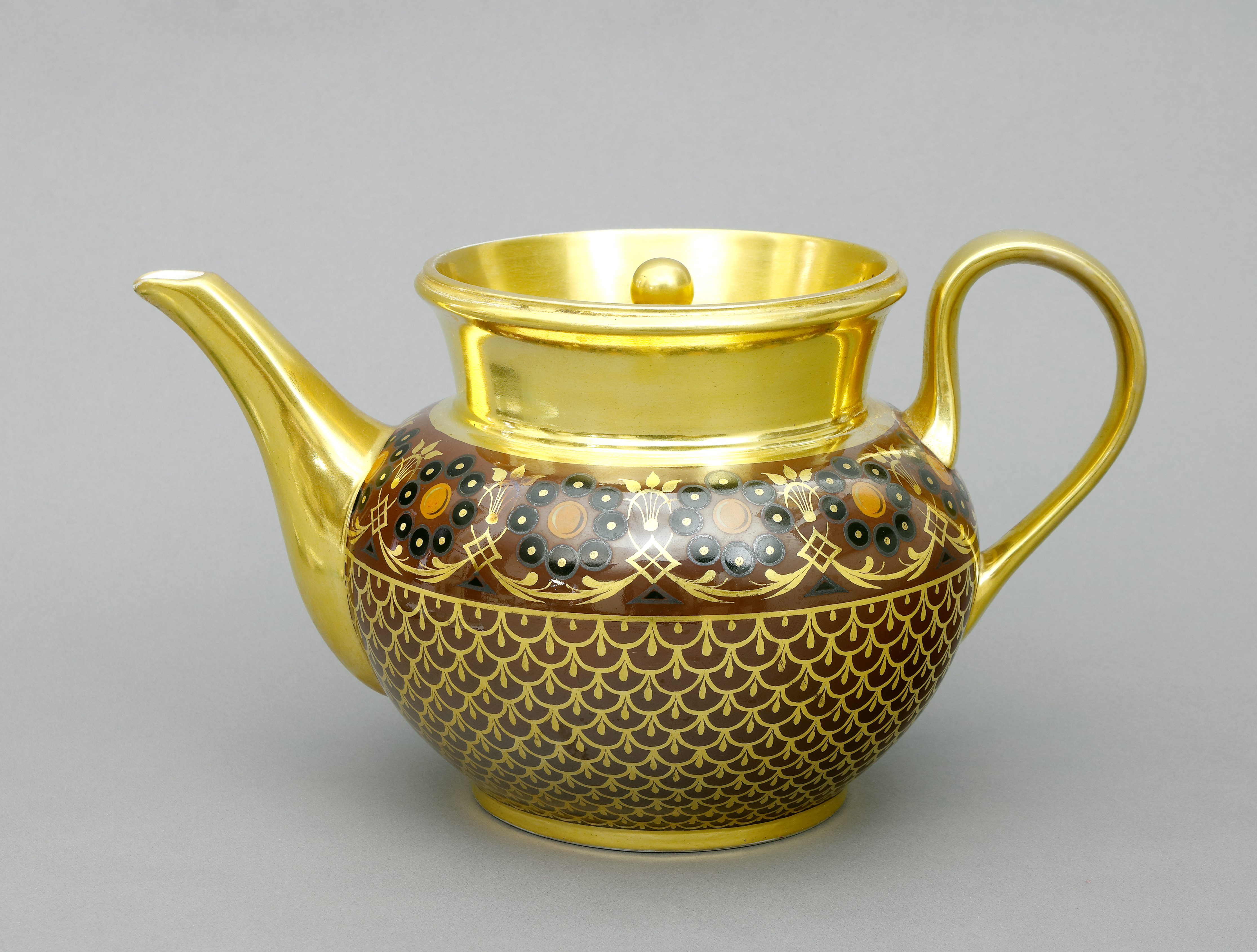 Balusterform mit Ohrhenkel und vertieftem Deckel. Porzellan, Goldtuschen auf braunem Lüsterfond. Reiche Vergoldung mit umlaufendem, braunem Band mit farbiger und goldener Ornamentik. Die Hälfte der Wandung mit goldenem Schuppendekor verziert. Sehr seltenes Dekor. Blaue Adlermarke mit Zepter und Rote Malermarke. (993-25)