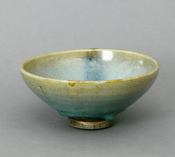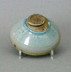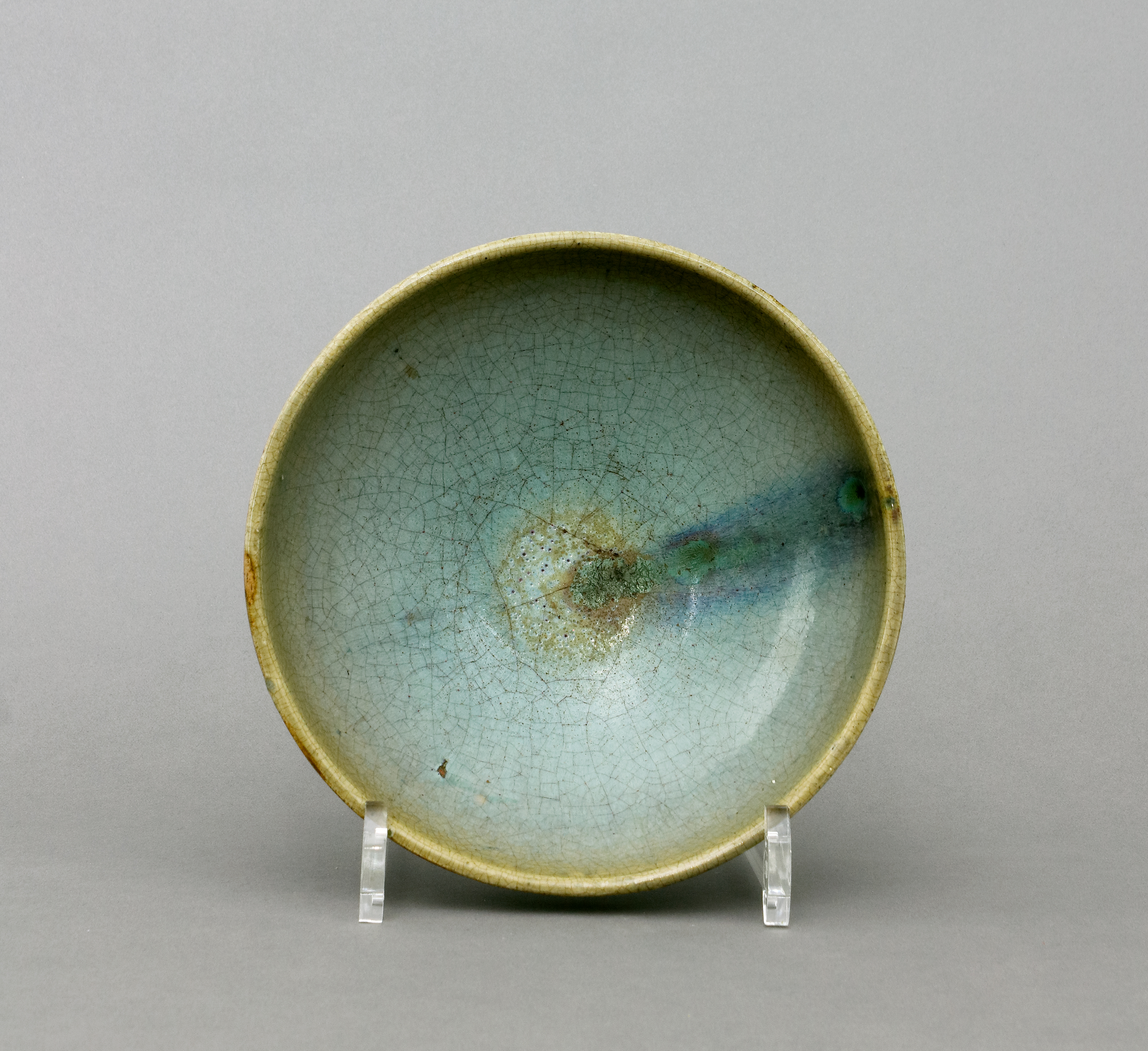 Hellbraunes Steinzeug tief gemuldet, mit dickwandiger hellblauer Claire de lune Glasur. Leichtes Krakelé mit dunkelblauem Verlaufsfleck. H.: 8 cm. D.: 17,5 cm. (993-33)