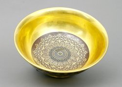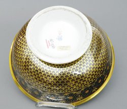 Rund, tief gemuldet, Balusterform, auf abgesetztem Stand. Außenwandung mit reicher Vergoldung mit umlaufendem, braunem Band mit farbiger und goldener Ornamentik. Die Hälfte der Wandung mit goldenem Schuppendekor verziert. Innen Vollvergoldung bis auf den Schalengrund, dort eine Wiederholung des äußeren Dekors. Sehr selten. Passend dazu rundes, vergoldetes Messing-Bronze Presentoire. H.: 11 cm, D.: 28 cm Blaue Adlermarke mit Zepter und Rote Malermarke. (993-39)