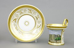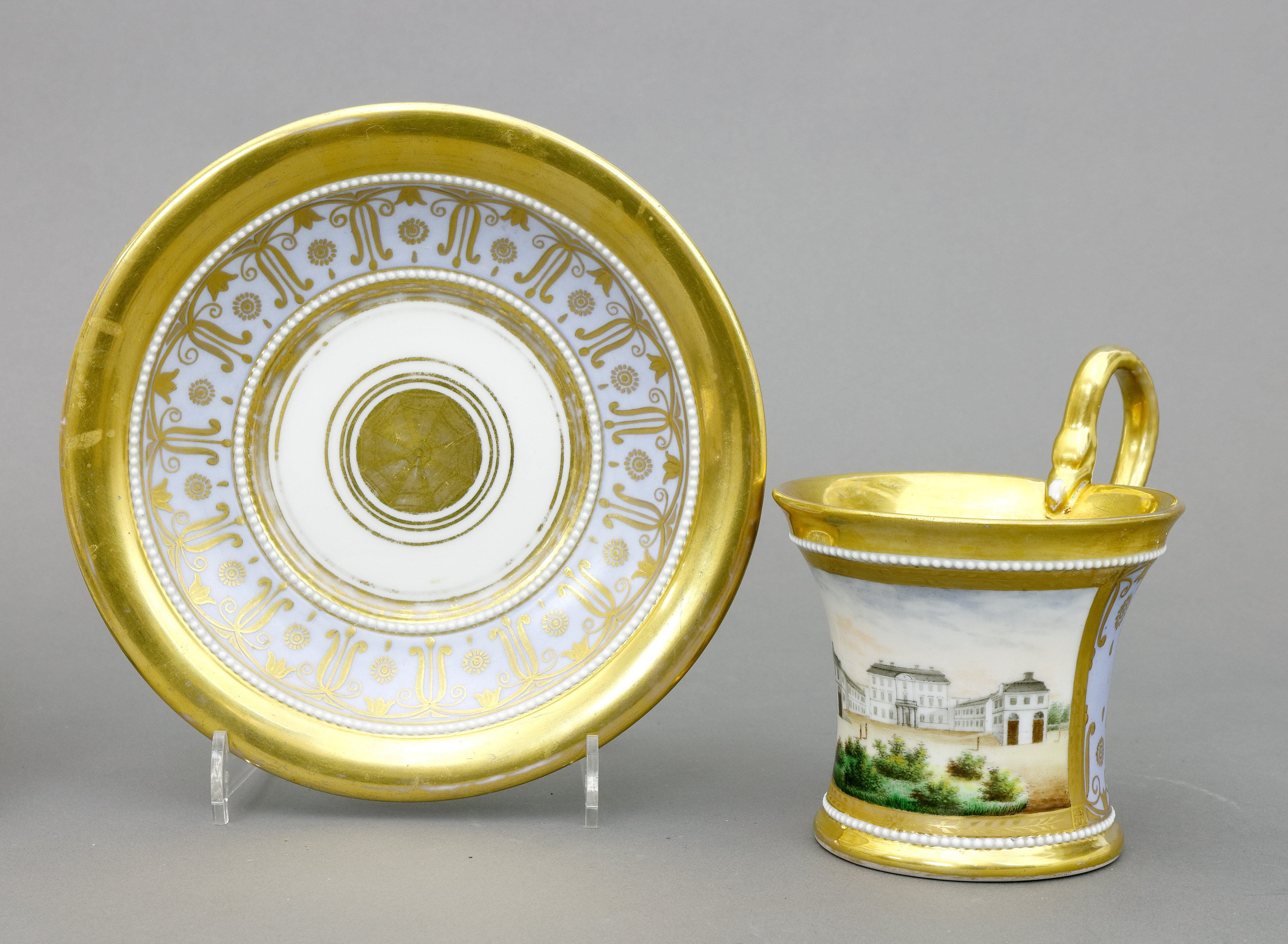 Konkave Becherform mit hohem über den Rand gezogenem Henkel. Weißer Perlrand an Lippenrand und Stand. Innenvergoldung. Schloß Rosersberg b. Stockholm, bunt gemalt. Rückseite florale Goldradierung auf hellblauem Grund, Wiederholung auf der Untertasse. Blaue Zeptermarke. -Beigegeben: Tasse mit bunt gemalter Ansicht des Königlichen Schloßes in Berlin, auf der Rückseite der Wandung und auf der Untertasse, florale Goldradierung. Restaurierte Stelle. Blaue Zeptermarke mit KPM 1837/44. Rote Reichsapfel -Malermarke. (993-42)