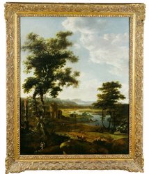 Weite Flusslandschaft mit Ruinen, Booten, Tier-und Personenstaffage. Öl auf Holz, parkettiert im 19. Jh. 78 x 61,5 cm. Am Unterrand mittig signiert J Sonje f(ecit). Gerahmt. (993-46)