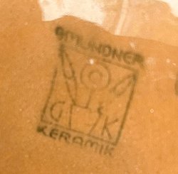 Ziegelroter Scherben, bunt staffiert. H 28,5 cm. Gepreßte Modelln° 844 und gestempeltes Firmensignet Gmundner Keramik. (993-49)