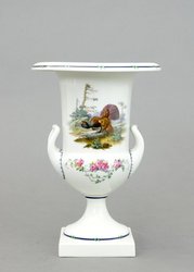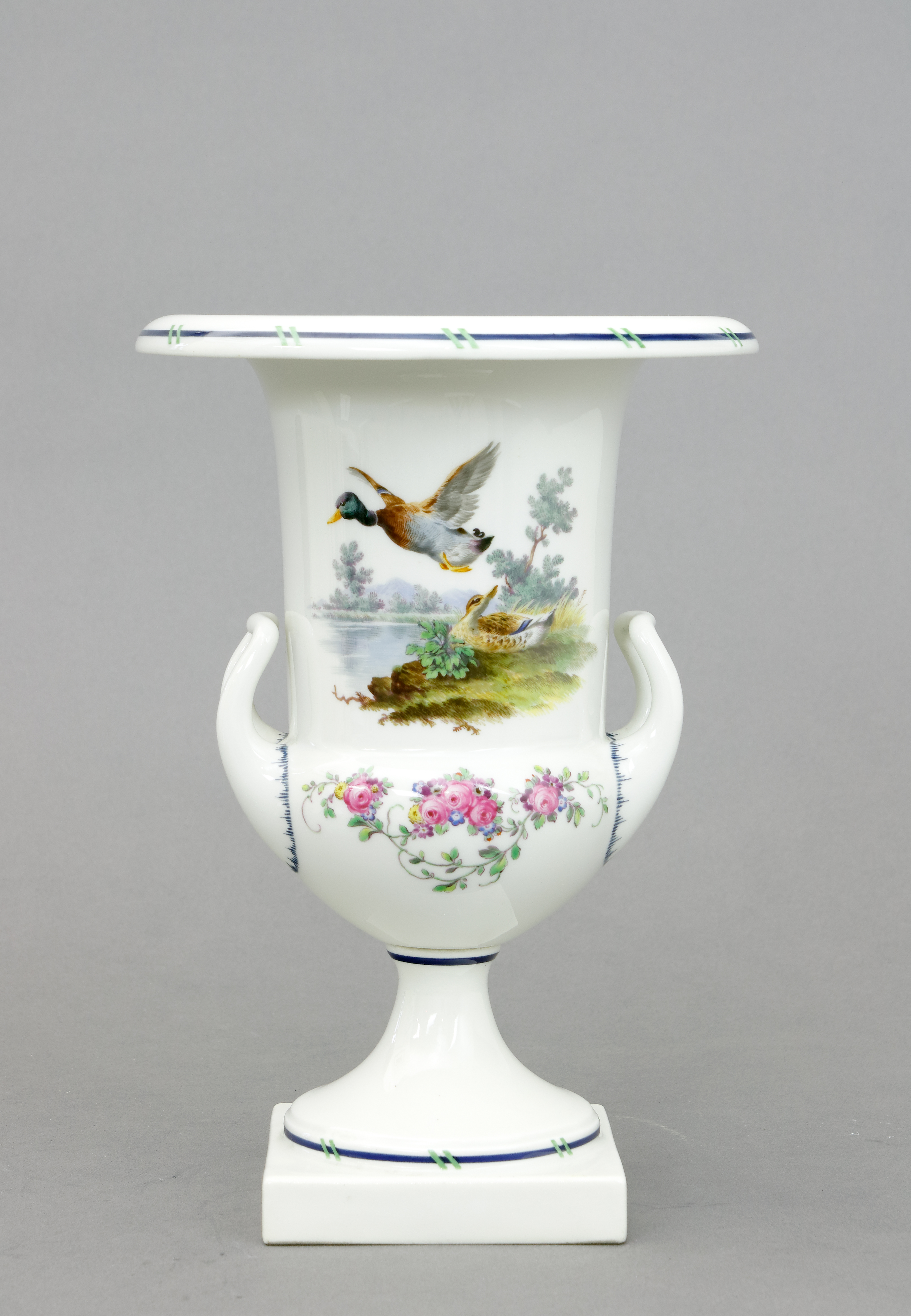 Entwurf Johann Carl Risse 1799. Auf tailliertem Rundfuß auf quadratischem Sockel sich erhebender Korpus mit tief angesetzten Handhaben, weit ausladendem Lippenrand. Beidseitig bunte Bemalung mit Enten bzw. Auerhahn, Blumenranken. Ränder blau/grün staffiert. H 21,5 cm. Blaue Zepter-und rote Reichsapfelmarke sowie schwarzes Kriegskreuz und Malerzeichen. (993-50)