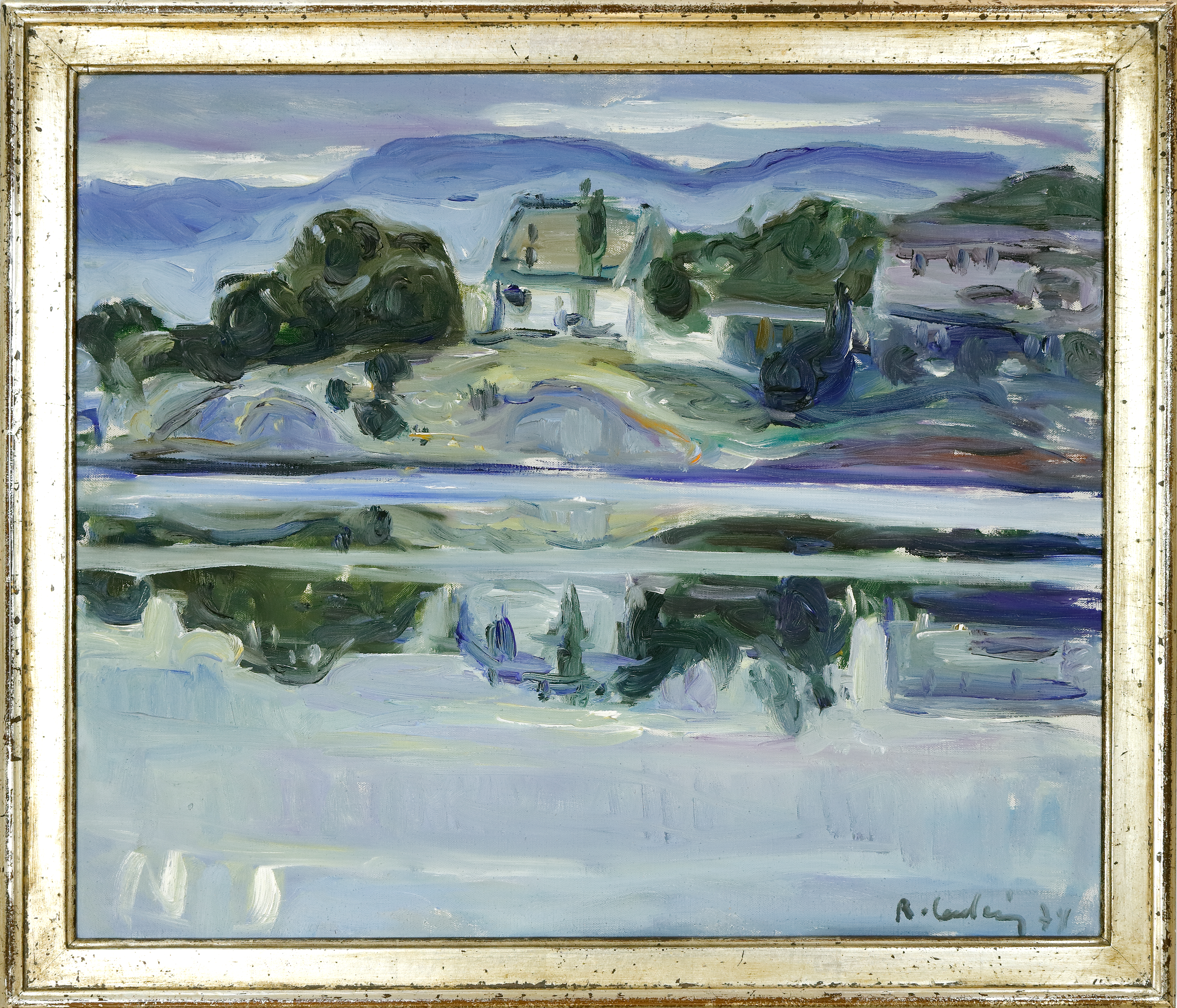 Norwegische Landschaft am Morgen. 19. 7. (19)74. Öl auf Leinwand. 54 x 65 cm. Links unten und rückseitig signiert sowie datiert. Gerahmt.  (988-9)