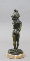 Kleine Apfeldiebin. Bronzefigur mit runder Plinthe auf rundem Marmorsockel. H 25/28 cm. Mit dem Schriftzug der "Düsseldorfer Broncebildgiesserei GmbH". (1007-18)