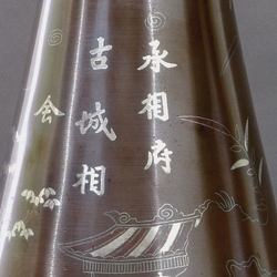 ein Paar Keulenform mit abgesetztem, rundem Stand auf Durchbruchstand. Silbertauschierung von Schriftzeichen (Minister Residenz, oder ewige Ministerresidenz, Alter Stadtminister), Pflanzen, kämpfenden Soldaten, und Gemäuer. Trompetenartige Öffnung mit silbernem Mäanderrand. H.: 63,5/68,5 cm. (1040-1)
