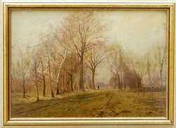 Parklandschaft mit Spaziergänger. Im Hintergrund Stadtsilhouette im Dunst. (18)87. Öl auf Malkarton, 30,5 x 43,3 cm. Rechts unten signiert, datiert und mit Ortsbezeichnung. Gerahmt. Einige kleine Retuschen. (1062-4)