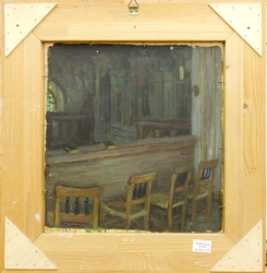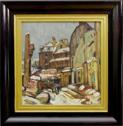 Winter im Städtchen. Öl auf Malkarton. 35,8 x 33,5 cm. Links unten signiert. Gerahmt. - Das Gemälde ist in Hans Hartigs Verkaufsbuch unter der Nr. 767 gelistet und wurde am 12. 1. 1916 für RM 100 verkauft. Die Rückseite zeigt eine im Mai 1906 entstandene Ölstudie des Inneren der Dorfkirche von Carnitz. (1071-5)