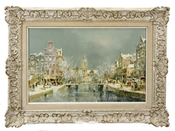 Holländische Stadtlandschaft im Winter (Delft ?). Öl auf Hartfaser. 43 x 68 cm. Rechts unten signiert. Rahmen am unteren Rand etwas beschädigt. (1081-1)