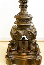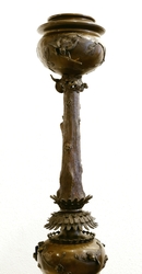 Messingbronze, teilweise Gold tauschiert mit plastischem Blüten- und Tierdekor (Elefantenköpfe und Tengu - Figuren, ambivalente Berggeister) sowie Aufsatzschale für Blumen oder Räuchermaterial versehen. Mit Holzpostament, H 147/165 cm. Dieses mit alten Wurmstichen und leichten Bereibungen. Provenienz: Aus dem Nachlass von Peter Hacks. (1100-1)