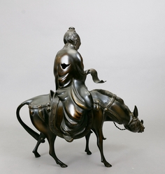 Mönch mit Rolle auf Maultier. Bronze, zweiteilig, mit brauner Patina, etwas berieben. H 38 x B 37,5 x T 15 cm. (1117-5)