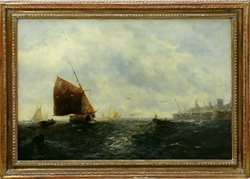 Segelboote nahe Hafen. Öl auf Leinwand, doubliert. 40,5 x 60,8 cm. Links unten signiert W Knell. Gerahmt. (1120-2)