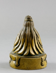 Heiliger und Brückenbauer. Auf ovalem stilisierten Lotusblatt Sockel sitzend, in der linken Hand eine Stupa haltend. Bodenplatte mit gekreutzem Vajra - Symbol vormals geöffnet. H.: 12 cm. (1126-1)