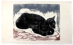 Ruhende Katze nach rechts. 1954. Farbholzschnitt auf Japan. 23 x 29,2 cm. Rechts unten signiert und datiert. (1127-3)