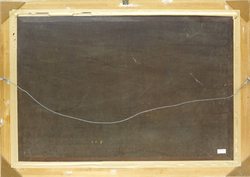Sonnenbeschienene, weite Landschaft mit Bauernhaus und Ochsenkarren nebst Hund. Öl auf Holz. 66 x 88,5 cm. Mittig signiert. Gerahmt. Krakelee. (116-1)