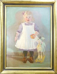Stehendes kleines Mädchen mit Holzpferd. (19)11. Öl auf grober Malpappe. 76,5 x 60,7 cm. Rechts unten signiert und datiert. Rückseitig mehrere zeitgenössische Klebezettel, einer davon mit eigenh. (?) Titel und Preis. Gerahmt. - Provenienz: Bassenge, Berlin, Dezember 1989, Lot 6652; Berliner Privatbesitz. (376-19)