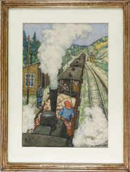 Kleinbahnidyll. Berlin. 1935. Mischtechnik, Aquarell und Deckfarben auf Karton, 48,6 x 34,5 cm. Rechts unten signiert und datiert sowie rückseitig betitelt. - Im Passepartout, unter Glas gerahmt. - Provenienz: Berliner Privatbesitz. - Lit.: Günter Meißner. Hans Baluschek. Dresden, Verlag der Kunst, 1985; T. Hoffmann, A. Grosskopf, F. Reifferscheidt (Hg.), Zu wenig Parfüm, zu viel Pfütze. Hans Baluschek zum 150. Geburtstag, Köln, Wienand, 2020. - Baluschek gilt als ein Hauptvertreter des deutschen kritischen Realismus. Er stellte in seinen Werken häufig das Leben der Arbeiterklasse dar. Auch Züge und Bahnhöfe sind ein beliebtes Motiv des Künstlers. Schon früh setzte die Begeisterung hierfür durch seinen Vater ein, der Eisenbahningenieur war. Baluschek gehört zu den Malern der Berliner Sezession. Von 1929-33 war er Leiter der Großen Berliner Kunstausstellung. Die Nazis setzten ihn 1933 von seinen Ämtern ab und brandmarkten seine Werke als entartet. 1933 und 1934 waren seine Werke noch auf der GBKA zu sehen und er illustrierte Ende 1934/Anfang 1935 noch die Jubiläumsschrift Hundert Jahre Deutsche Eisenbahn.  (595-1)
