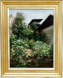 Hausgarten. Öl auf Leinwand. 65 x 50,3 cm. Rechts unten signiert, rückseitig auf Papierschild bezeichnet: aus den Skizzen zu "In der Sommerfrische". Gerahmt. - Lüben begann seine künstlerische Ausbildung 1853 in Berlin und setzte diese ab 1860 in Antwerpen fort. Seit 1876 war er in München tätig. - Vgl. von Boetticher, Malerwerke des 19. Jh., I/2, 1969, S. 938.  (992-9)