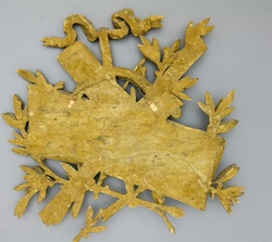 Künste Mit Zirkel, Maß, Winkelmesser und Zeichenrolle können die Künste der Architektur kaum besser versinnbildlicht werden. Der dargestellte Lorbeer bedeutet Anerkennung und Ruhm. Das ionische Kapitell mit der kannelierten Säule und die Amphorenvase sind ein Hinweis auf die Antike. Original Vergoldung. Ca. 60 x 55 cm. (993-21)