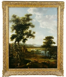Weite Flusslandschaft mit Ruinen, Booten, Tier- und Personenstaffage. Öl auf Holz, parkettiert im 19. Jh. 78 x 61,5 cm. Am Unterrand mittig signiert J Sonje f(ecit). Gerahmt. (993-46)