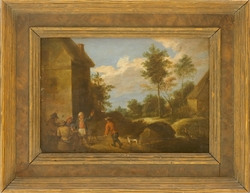 Dorflandschaft mit drei zechenden Bauern um einen Tisch vor einer Scheune. Der daneben stehende Wirt beim Begrüßen eines Wanderers mit Hund. Rechts ein weiteres Gehöft zwischen Bäumen, vorn Felsen und Bach. Öl auf Holz. 18 x 25,5 cm. Gerahmt. - Mit Gutachten von Dr. Ernst Buchner vom 22. 10. 1951. - Provenienz: Leo Spik, 16. 10. 1986, Lot 475 (Zuschlag 20.000 DM); Berliner Privatbesitz. (993-5)