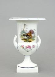 Entwurf Johann Carl Risse 1799. Auf tailliertem Rundfuß auf quadratischem Sockel sich erhebender Korpus mit tief angesetzten Handhaben, weit ausladendem Lippenrand. Beidseitig bunte Bemalung mit Enten bzw. Auerhahn, Blumenranken. Ränder blau/grün staffiert. H 21,5 cm. Blaue Zepter- und rote Reichsapfelmarke sowie schwarzes Kriegskreuz und Malerzeichen. (993-50)