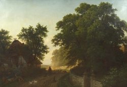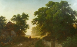 Sonnenbeschienene, weite Landschaft mit Bauernhaus und Ochsenkarren nebst Hund. Ã...