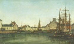 Uferlandschaft mit Booten und Fischern. 1871. Öl auf Leinwa...